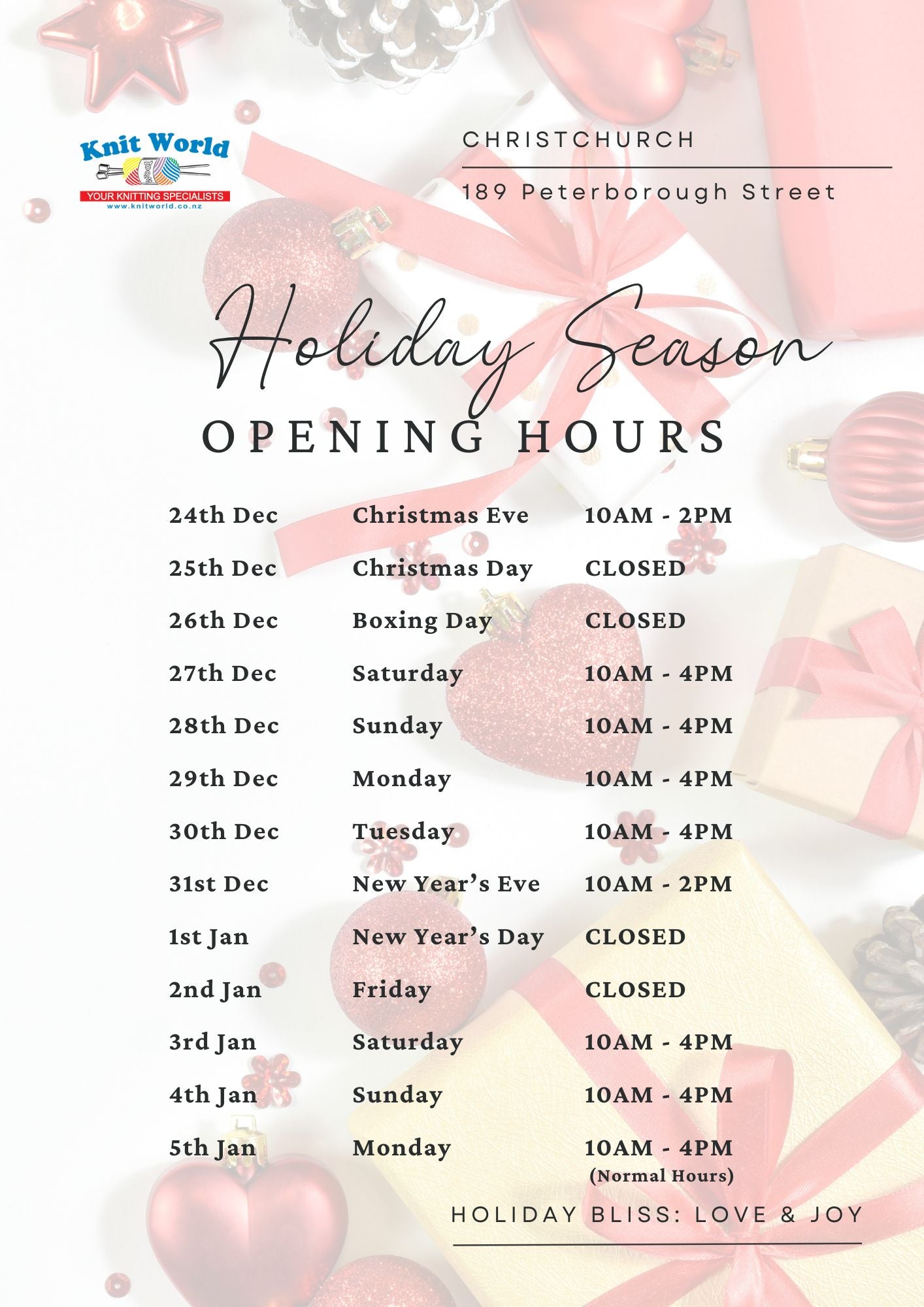 🧶 Holiday Season Opening Hours 🧶