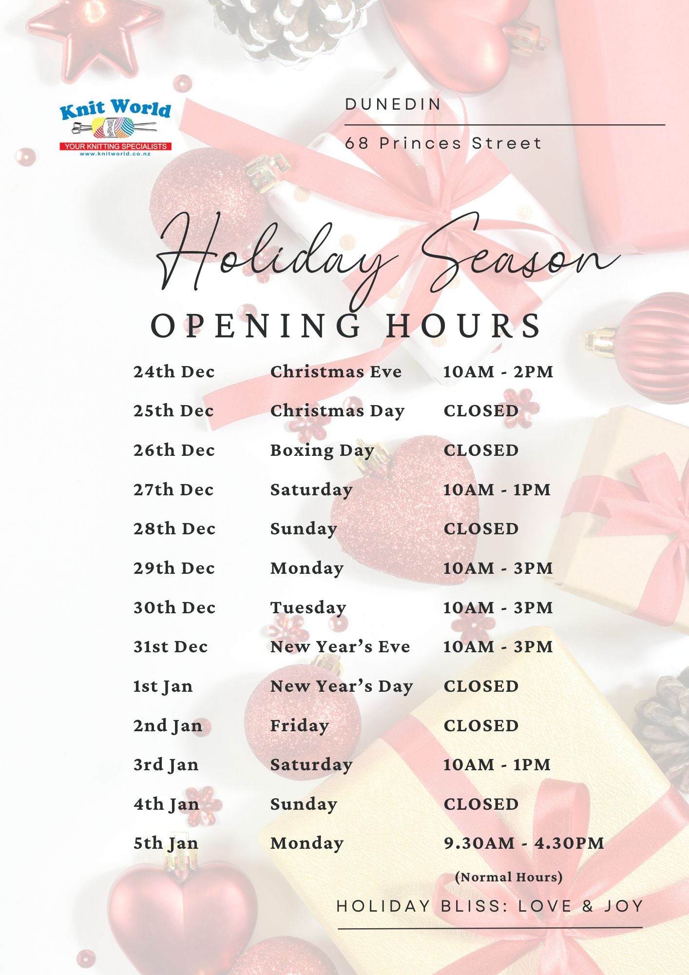 🧶 Holiday Season Opening Hours 🧶