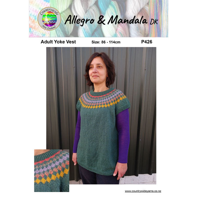 This stylish yoke vest is a fun knit that blends colour and texture beautifully using Countrywide Yarns Allegro DK and Mandala 8ply. With its seamless circular yoke and neat shaping, it’s a versatile layering piece perfect for year-round wear. The Mandala yarn adds subtle colour variation, or swap it for a third Allegro shade for a custom look.